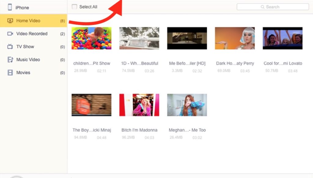 - Click on Video Option and you will see all the existing videos of your iPhone with some options at the top to add, delete, and export videos